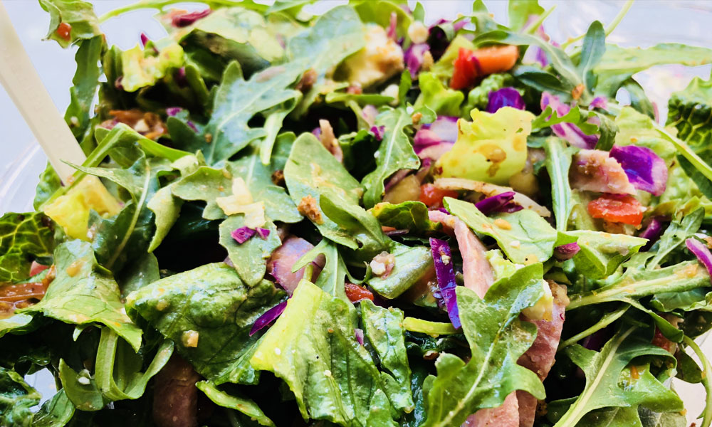 Rice noodles, sushi-grade salmon poké cubes, Small Axe Farm mixed greens, spicy mayo, house eel sauce, shredded organic pink turnip, organic edamame, organic scallion, pickled ginger, sesame seeds -