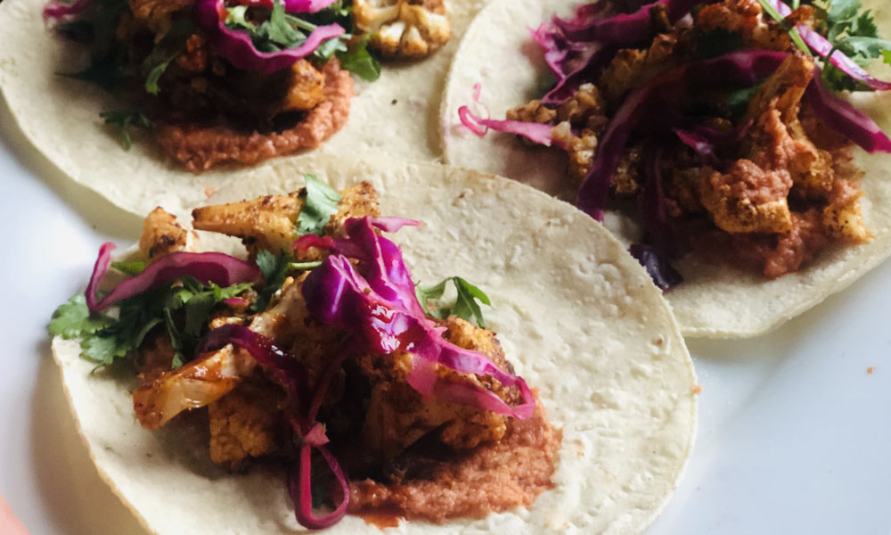 Roasted Pete's Greens organic cauliflower, house romesco sauce, pickled purple cabbage, organic cilantro, grilled VT corn tortilla -
