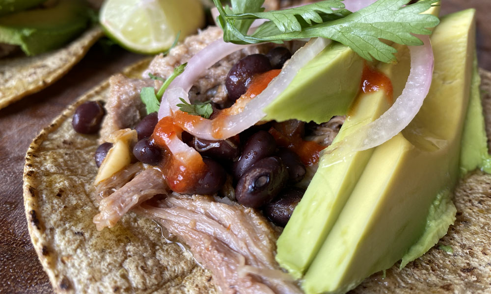 6-hour braised local pork butt, Small Axe Farm pink turnip, chopped organic white onion, gochugang sauce, chopped scallion, Small Axe Farm rainbow micro greens, lime, grilled VT corn tortilla -